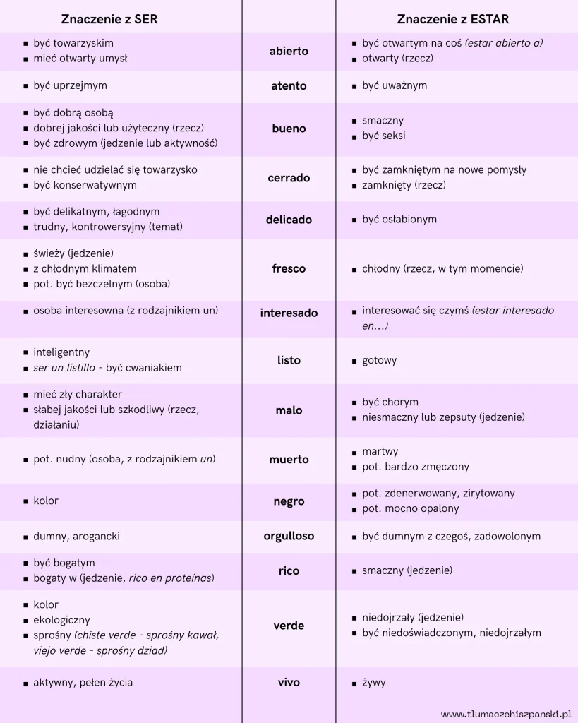 Pewne przymiotniki zmieniają znaczenie w zależności od tego, czy użyjemy ich z ser lub estar. Na przykład ser claro to cecha wyglądu, oznacza że coś jest jasnego koloru lub jasne w kontekście światła (fizycznie). Z kolei estar claro oznacza, że coś jest zrozumiałe. Poniżej znajdziesz najpopularniejsze przymiotniki, które występują z tymi dwoma czasownikami oraz ich wyjaśnienie.